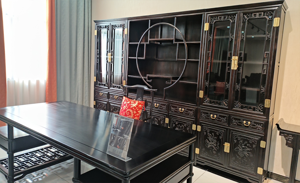 江蘇中尊木業有限公司書房系列產品:書房五件套草龍書柜、草龍大班枱、卷書寶座椅,洋花寫字枱等。